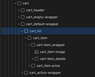 - Add a div inside the list div we just created. This second div will serve as template for each cart item.